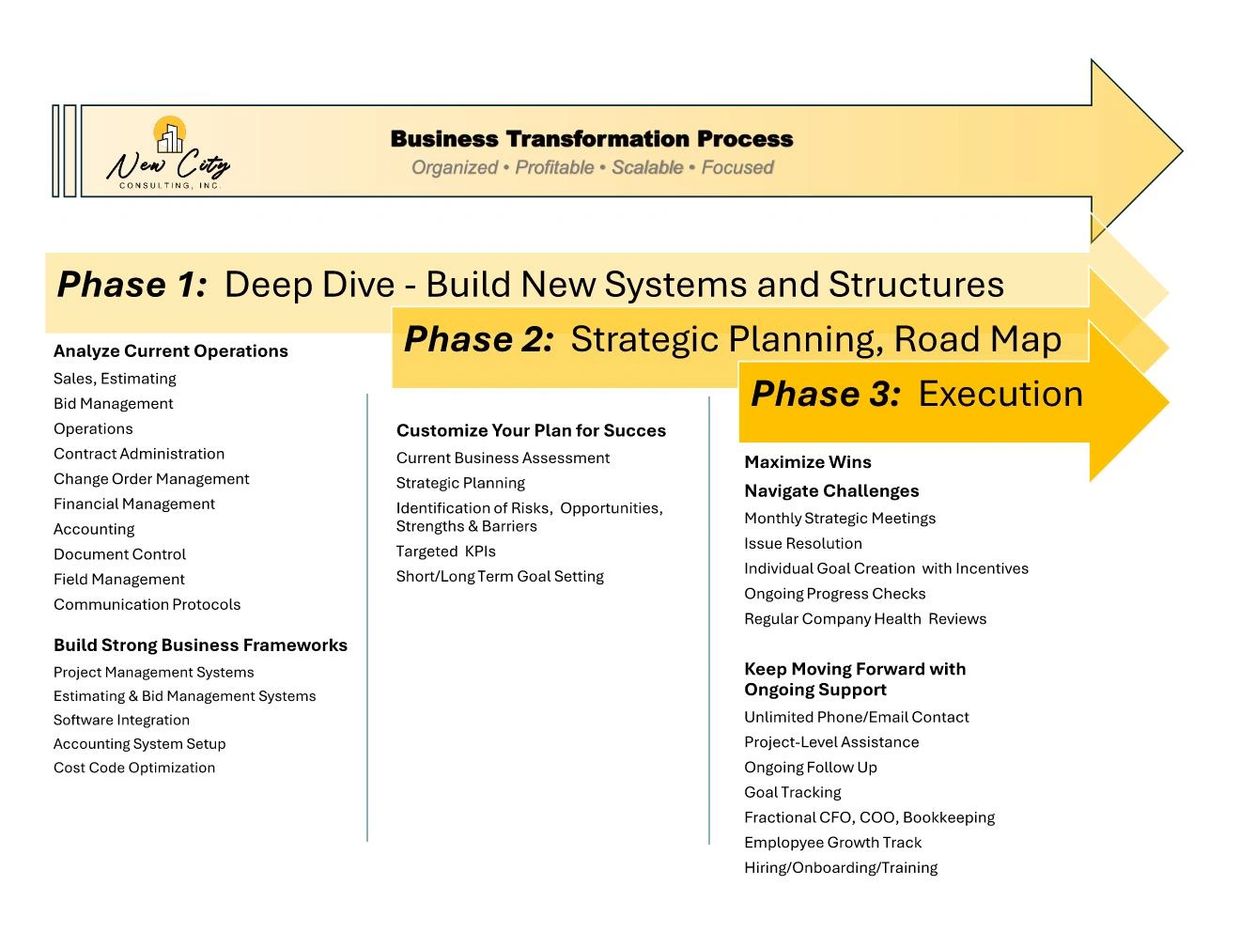 New City’s consulting services are designed to meet contractors at any stage, whether it is improving estimating and project management processes, implementing stronger financial controls, or building long-term growth strategies. By combining real-world construction expertise with proven business practices, Patrick ensures clients have the clarity, structure, and confidence they need to take on bigger opportunities and achieve sustainable success.